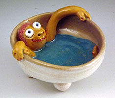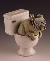 But, it is her ceramic pieces that add a special dimension to the gallery. They make people smile! Her sense of humor combined with immense technical skill result in wonderful works of art, including her unique animal images. Much of her work focuses on whimsical treatments of animals and she has produced a whole collection of “fantasy lives of pets.” She confesses to loving the funny papers and finds them a source of inspiration. She also finds humor in everyday life. An ordinary soap dish is not so ordinary if Pam makes it! There is always an unexpected element—like finding a bathing beauty soaking in the dish.