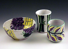 Pam also specializes in majolica techniques. Majolica originated in the Middle East in the 9th c. but is most associated with Italy and Spain. Ware made using these techniques was imported to Italy in the 13th c. through the Isle of Majorica, and the Italians started calling it “majolica.” They soon became experts at copying the technique and majolica ware came into prominence during the Italian Renaissance.