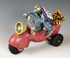To achieve her fanciful artworks, Pam starts with wheel-thrown parts, which she assembles, adding pinched and pieced bits of clay to flesh out features and appendages. Her clay is usually a mid-range white stoneware, fired to cone 7 (about 2260 F). B-Mix 5 works very well for assemblages as it is less susceptible to cracking than porcelains. For more surface interest under glazes, she also uses Miller 50, a speckled clay. She incorporates her expertise in non-traditional surfacing techniques applying different types of finishes to her figures. These non-traditional finishes, also called “cold finishes,” include using non-ceramic materials. A “skin” of black acrylic wash is applied to bisqueware that has been fired to cone 04 (about 1940 F) in an electric kiln, followed with a “canvas” of dry-brushed white acrylic. Then she layers colored acrylic, patinas, inks, and organic materials to build color and depth on her non-functional pieces. No additional firing takes place.